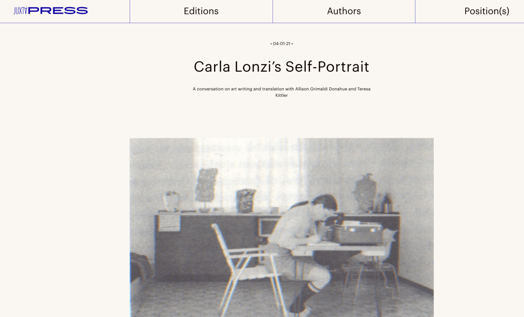 I can’t even begin to express what a joy it was to talk with Teresa Kittler about Carla Lonzi and Autoritratto for this interview. We gushed, we speculated, we worshiped. And then we had a drink…because that was still possible…Read it here ❤ ps. Thank you to Octavia Stocker for her excellent editing.